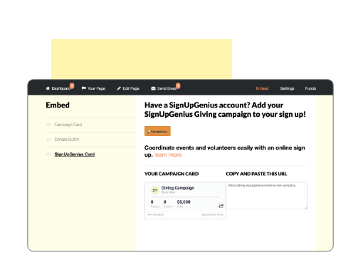 It’s easy to embed your fundraising campaign on a sign up so people can view your volunteer opportunities and donate in one place.